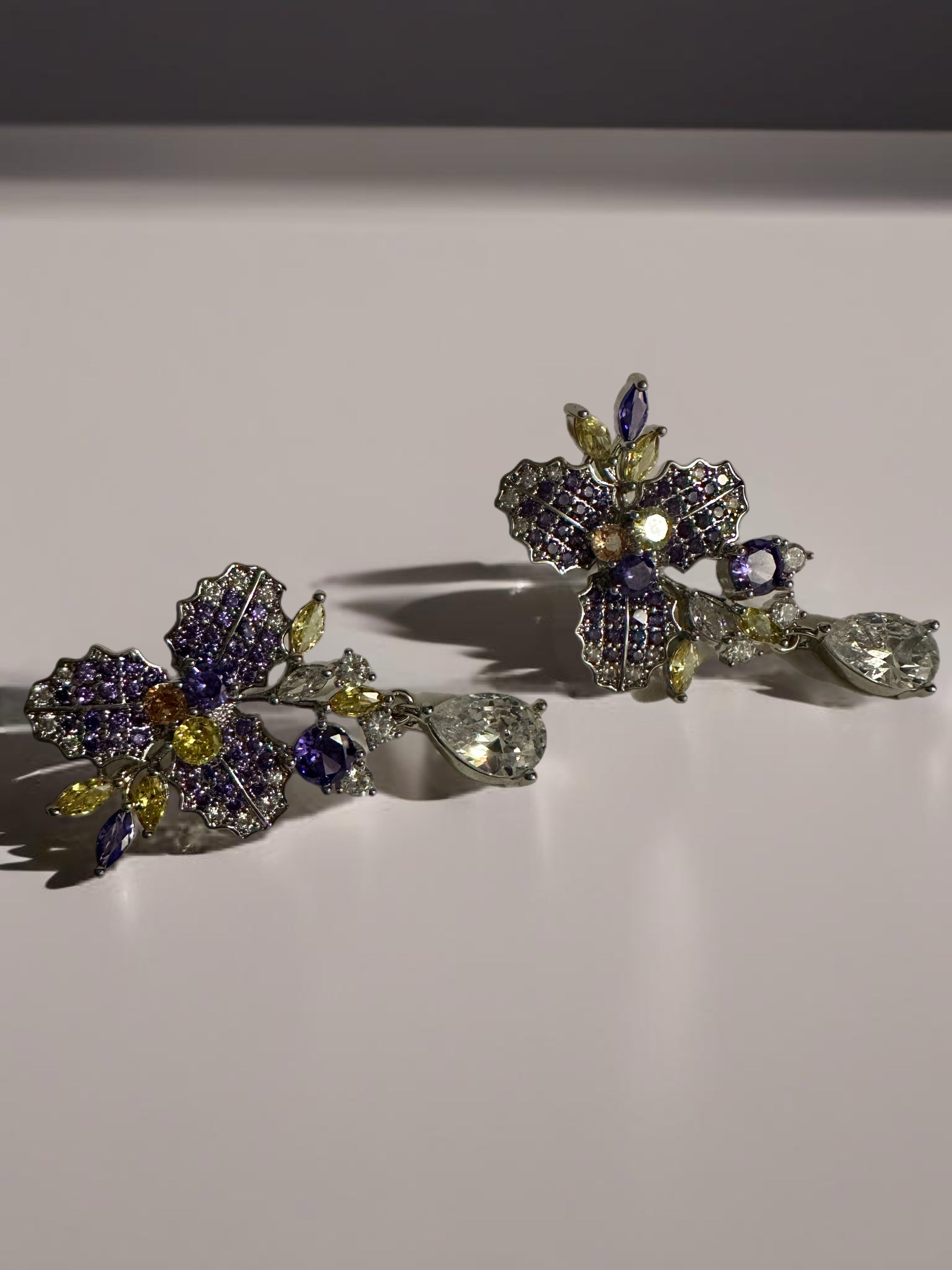 Zirconia Flower Leaf Earrings - Purple & Yellow, Elegant Design with Sparkling Accents